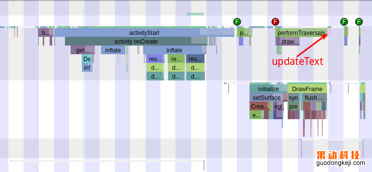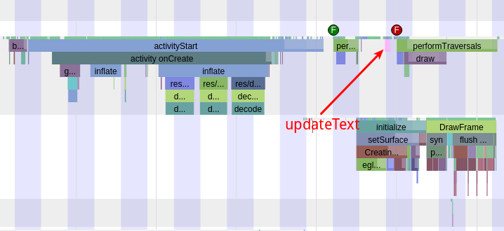 并沒有. 因為我們知道, 應用啟動的時候,要等兩次 performTraversals 都執行完成之后才會顯示幀, 而 updateText 這個方法在個 performTraversals 執行之前就執行了. 所以 updateText 方法的執行時間是算在應用啟動的時間里面的.