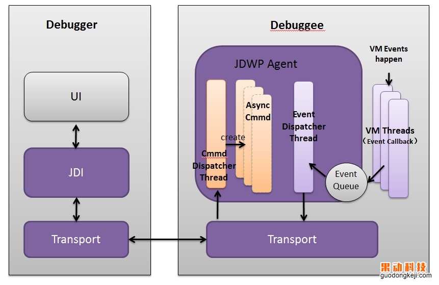 Debugger 通過發送命令獲取Debugee虛擬機的信息以及控制程序的執行。Debugger虛擬機通過發送 命令通知 Debugger 某些事件的發生,如到達斷點或是產生異常。