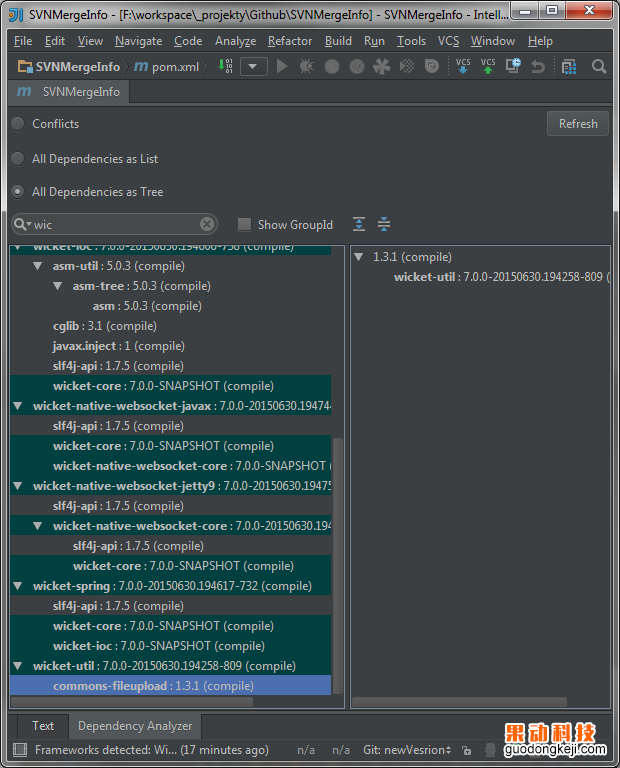 一旦安裝了Maven Helper插件,只要打開pom文件,就可以打開該pom文件的Dependency Analyzer視圖(在文件打開之后,文件下面會多出這樣一個tab),進入Dependency Analyzer視圖之后有三個查看選項,分別是Conflicts(沖突)、All Dependencies as List(列表形式查看所有依賴)、All Dependencies as Tree(樹結構查看所有依賴)。并且這個頁面還支持搜索。很方便!并且使用該插件還能快速的執行maven命令。