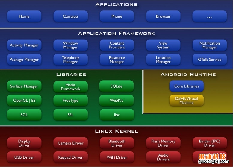 iOS是基于UNIX內核,android是基于Linux內核,iOS和android作為兩款的手機操作系統,他們有共性有區別,下面分享一張android系統架構圖: