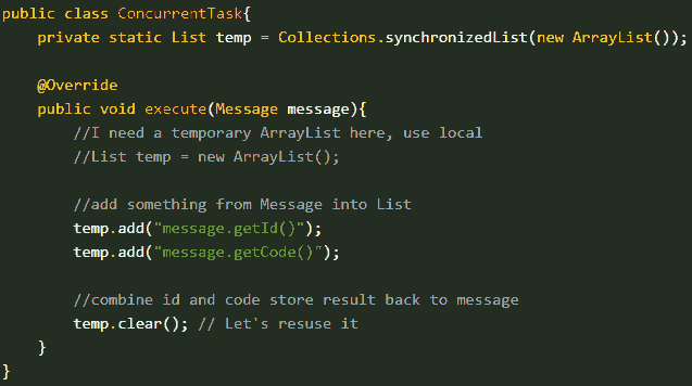 應該總是使用本地變量,而不是創建一個類或實例變量,通常情況下,開發人員使用對象實例作為變量可以節省內存并可以重用,因為他們認為每次在方法中創建本地變量會消耗很多內存。下面代碼的execute()方法被多線程調用,為了實現一個新功能,你需要一個臨時集合Collection,代碼中這個臨時集合作為靜態類變量使用,然后在execute方法的尾部清除這個集合以便下次重用,編寫這段代碼的人可能認為這是線程安全的,因為 CopyOnWriteArrayList是線程安全的,但是他沒有意識到,這個方法execute()是被多線程調用,那么可能多線程中一個線程看到另外一個線程的臨時數據,即使使用Collections.synchronizedList也不能保證execute()方法內的邏輯不變性,這個不變性是:這個集合是臨時集合,只用來在每個線程執行內部可見即可,不能暴露給其他線程知曉。