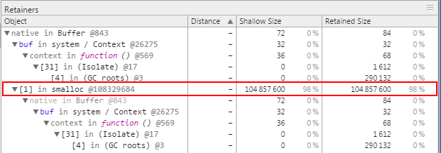 在這種情況下,只要 data 變量仍在范圍中,就會保留 buf。buf 緩沖區的大小會導致保留大量內存,即使這對應用程序開發者而言不那么明顯。我們可以使用 Chrome 開發者工具查看此效果,如在完成 while 循環后獲得的快照所示:保留了更大的緩沖區,盡管不再使用它。