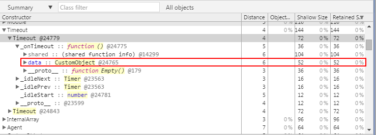 通過使用 Chrome 開發者工具,我們可以看到表示計時器的 Timeout 對象通過 _onTimeout 字段而擁有完成函數(傳遞給 setTimeout 的匿名方法)的引用: