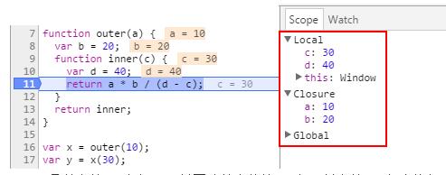 inner 函數在第 17 行調用(前面清單中的第 11 行)并在第 11 行上執行(該清單的第 5 行)。在第 16 行(清單中第 10 行),調用了 outer 函數 — 它返回 inner 函數。如屏幕截圖所示,在第 17 行調用了 inner 函數并在第 11 行執行時,它能夠訪問它的局部變量(c 和 d)和outer 函數中定義的變量(a 和 b) — 盡管在第 16 行完成對 outer 函數的調用時已退出outer 函數的范圍。