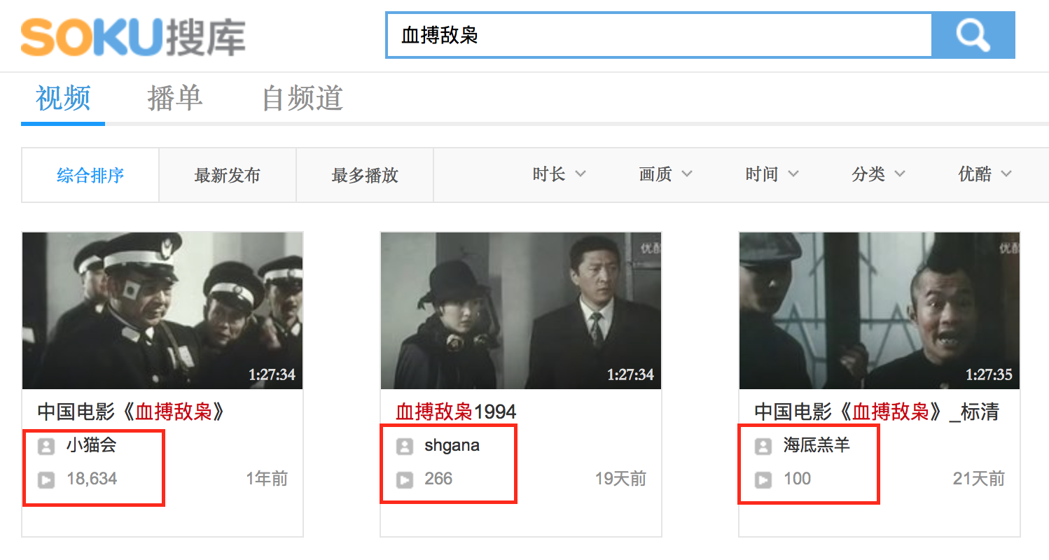首先,這三部涉及侵權的電影《血搏敵梟》并非優酷官方上傳,所有優酷官方發布的視頻都以作品名作為用戶名,例如電視劇《好先生》的上傳者為“電視劇好先生”,觀眾以此區分是否為官方正版視頻。