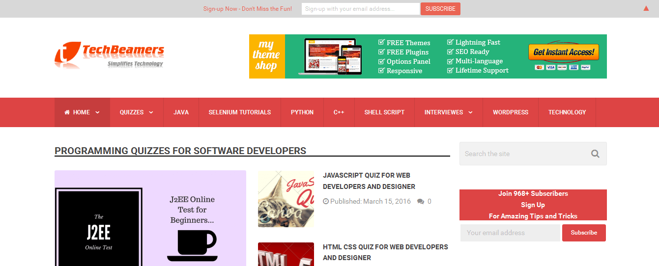 Techbeamers是一個在線資源類網站,提供Java, Python, Selenium, Unix/Linux等語言的編程測驗。此外,該網站還提供大量各種編程語言和技術的在線教程,例如WordPress,Shell Script,C++,Java 和 Selenium。TechBeamers也能夠讓開發者為模擬面試的提問找到答案,以便他們為工作面試做好準備。