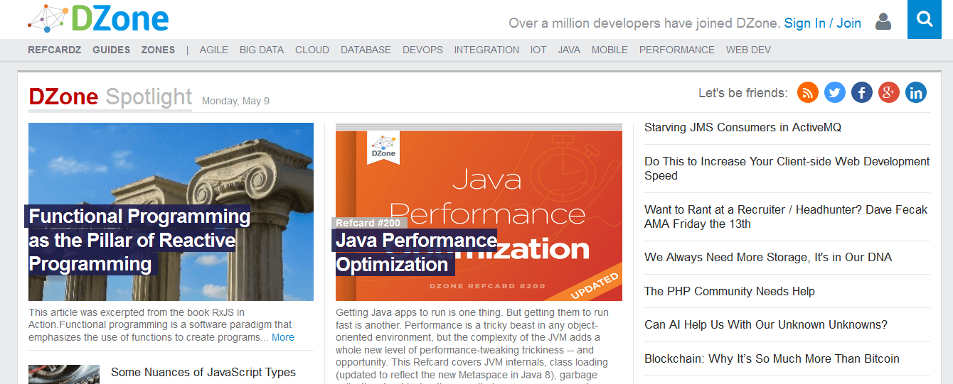 DZone對專業軟件開發者來說是大的資源網站之一。該網站發布各技術領域的高技術含量內容,例如大數據,云計算,Java,物聯網,web開發等。除此之外,它也是一個非常受歡迎的在線社區,活躍用戶超過一百萬人。DZone以白皮書,報告,代碼結構,鏈接,文章等形式提供一系列學習資源。