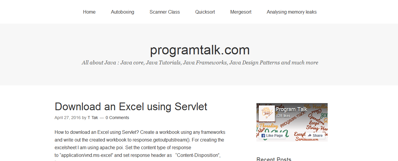 ProgramTalk是一個以學習Java技術為主題在線資源類網站,內容涵蓋Java代碼,Java框架,Java設計模式等。該網站有眾多的Java教程資源,涉及面很廣,包括歸并排序算法,自動打包,快速排序算法,內存泄漏檢測等。