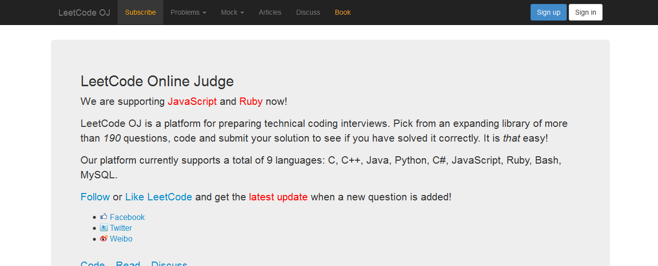 LeetCode是一個在線Q&A平臺,目前支持9種編程語言,包括Java,C++,C,Python,JavaScript和Ruby。LeetCode的Q&A板塊有一個單獨的模擬面試區域,該區域讓開發者處理困難的問題。除此之外,該網站還提供與數據庫、算法有關的編程問題的解決方法。
