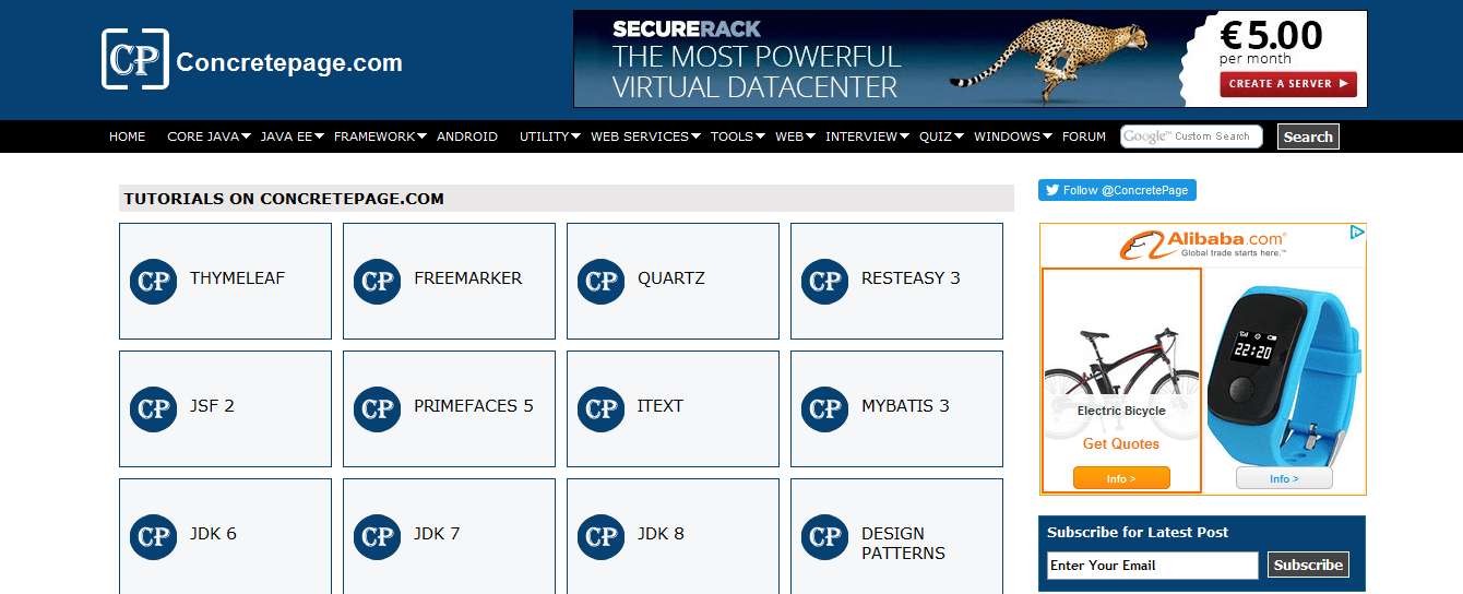 Concrete Page無疑是學習Java大的的資源類網站之一。在此網站,您可以找到各種Java框架,核心JDK,Java EE平臺,Java SE平臺的相關教程。Concrete Page提供關于Spring框架,Struts 2,Hibernate,Quartz,JDK 8 ,Java APIs等的教程。