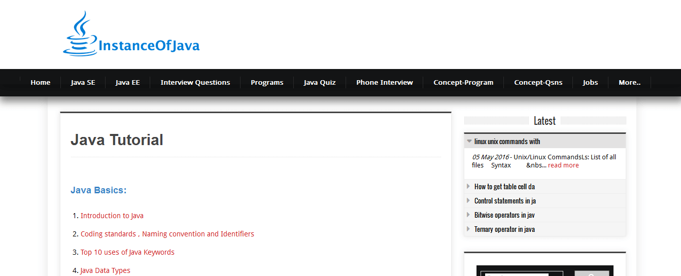 Instance Of Java是一個非常受歡迎的在線學習Java的網站。該網站涵蓋了流行的Java編程概念,包括Java基本概念,面向對象的概念,陣列,異常處理,java字符串,封裝類等。此外,該網站還提供從基本到進階的Java代碼面試題及回答方式。