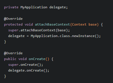 上面提到 Application 由于啟動就被加載而不能被更新的問題,我們代理了真實 Application 類的創建過程。通過代理Application,控制 Application 從新 dex 文件中加載。假設真實的 Application 類是 MyApplication。我們在編譯期間自動修改 AndroidManifest.xml 文件,把 MyApplication 替換為 MoaiApplication(是 App 的入口 Application)。App 啟動后由 MoaiApplication 加載完相應的文件(dex/資源文件/so 文件)后,再將控制權交回給 MyApplication。