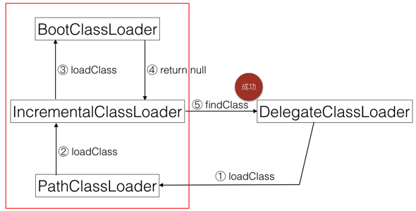 在這方面 Instant Run 的設計很精巧。它讓 PathClassLoader 插入的父 loader (IncrementalClassLoader)包裝了DelegateClassLoader,并且把 DelegateClassLoader 的父 loader 設置為 PathClassLoader,使得類加載的路徑變成: