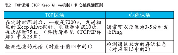 這里有必要提一下重連機制的必要性,我們知道 TCP 也有?;顧C制,但與我們在這里討論的“心跳保活”機制是有區別的,見表2。