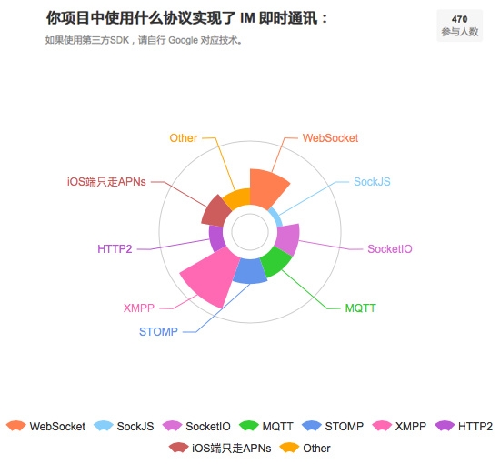 在此特別提一下排名第二的 WebSocket,區別于上面的聊天協議,這是一個傳輸通訊協議,那為什么會有這么多人在即時通訊領域運用了這一協議?除了上文說的長連接特性外,這個協議 Web 原生支持,有很多第三方語言實現,可以搭配 XMPP、MQTT 等多種聊天協議進行使用,被廣泛地應用于即時通訊領域。
