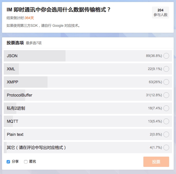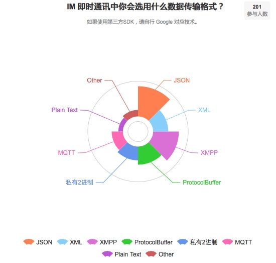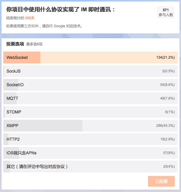 注:本次投票是發布在微博@iOS程序犭袁 ,鑒于微博關注機制,本數據只能反映出 IM 技術在 iOS 領域的使用情況,并不能反映出整個IT行業的情況。
