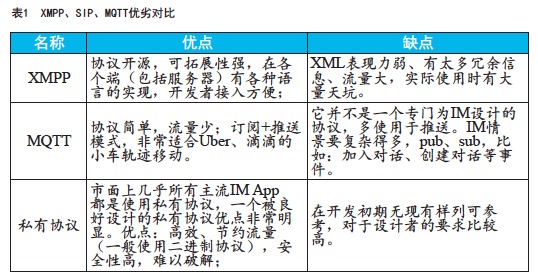 IM 協議選擇原則一般是:易于拓展,方便覆蓋各種業務邏輯,同時又比較節約流量。后一點需求在移動端 IM 上尤其重要。常見的協議有:XMPP、SIP、MQTT、私有協議。我們這里只關注前三名,見表1。