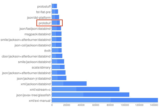 圖12為 thrift-protobuf-compare,測試項為 Total Time,也就是指一個對象操作的整個時間,包括創建對象,將對象序列化為內存中的字節序列,然后再反序列化的整個過程。從測試結果可以看到Protobuf的成績很好。