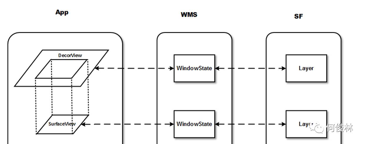 它繼承自類View,因此它本質上是一個View。但與普通View不同的是,它有自己的Surface。有自己的Surface,在WMS中有對應的WindowState,在SurfaceFlinger中有Layer。我們知道,一般的Activity包含的多個View會組成View hierachy的樹形結構,只有頂層的DecorView,也就是根結點視圖,才是對WMS可見的。這個DecorView在WMS中有一個對應的WindowState。相應地,在SF中對應的Layer。而SurfaceView自帶一個Surface,這個Surface在WMS中有自己對應的WindowState,在SF中也會有自己的Layer。雖然在App端它仍在View hierachy中,但在Server端(WMS和SF)中,它與宿主窗口是分離的。這樣的好處是對這個Surface的渲染可以放到單獨線程去做,渲染時可以有自己的GL context。這對于一些游戲、視頻等性能相關的應用非常有益,因為它不會影響主線程對事件的響應。但它也有缺點,因為這個Surface不在View hierachy中,它的顯示也不受View的屬性控制,所以不能進行平移,縮放等變換,也不能放在其它ViewGroup中,一些View中的特性也無法使用。