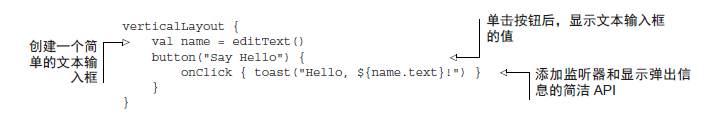 下面是 Anko 的一個(gè)簡(jiǎn)單例子,可以品嘗到使用 Kotlin 進(jìn)行 Android 開(kāi)發(fā)的滋味。只要把這段代碼放在一個(gè) Activity 中,一個(gè)簡(jiǎn)單的 Android 應(yīng)用就做好了!