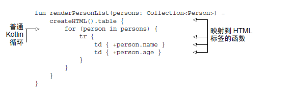 可以輕松地把映射到HTML標(biāo)簽的函數(shù)和常規(guī)的Kotlin語(yǔ)言結(jié)構(gòu)組合起來(lái)。你不再需要使用一門(mén)獨(dú)立的模板語(yǔ)言,也不需要學(xué)習(xí)新的語(yǔ)法,僅僅使用循環(huán)就可以生成HTML頁(yè)面。