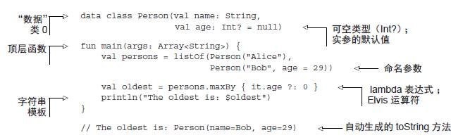讓我們從一個(gè)小例子開(kāi)始,來(lái)看看 Kotlin 代碼長(zhǎng)什么樣子。這個(gè)例子定義了一個(gè) Person 類(lèi)來(lái)表示“人”,創(chuàng)建一個(gè)“人”的集合,查找其中年紀(jì)大的人,并打印結(jié)果。盡管這是非常小的一段代碼,從中也可以看到 Kotlin 許多有趣的特性。