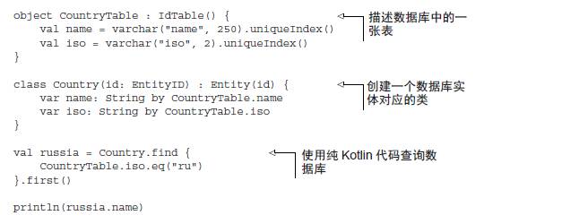 另一個(gè)能用上Kotlin干凈和簡(jiǎn)潔的DSL的用例是持久化框架。例如,Exposed 框架(https://github.com/jetbrains/exposed)就提供了易讀的 DSL,可以完全使用 Kotlin 代碼來(lái)描述 SQL 數(shù)據(jù)庫(kù)的結(jié)構(gòu)并執(zhí)行查詢(xún)操作,并且有全面的類(lèi)型檢查。下 面這個(gè)小例子展示了可行的做法 :