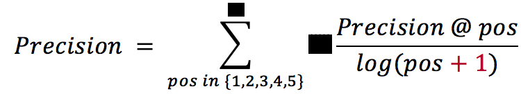 準確率(Precision): 預測出的標簽命中了標注標簽中的任何一個即視為正確。終的準確率為每個位置上的準確率按位置加權。準確率評測的公式如下: `math Precision = \sum_{pos \in \{1,2,3,4,5\}} \frac {Precision@pos} {log_{pos + 1}} `