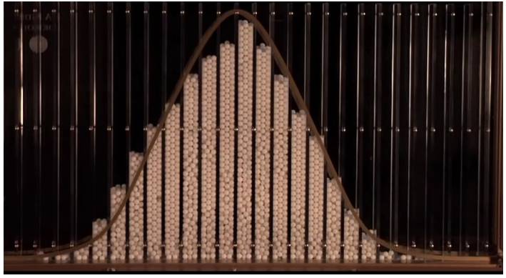 在十九世紀(jì),鐘形曲線被看作是自然界中一種常見的模式。(例如,我們已經(jīng)注意到,人的身高分布是一個鐘形曲線)。Galton Boards通過在裝有釘子的木板上放置大理石來模擬重復(fù)隨機(jī)事件的平均值,重現(xiàn)了大理石分布的正態(tài)曲線: