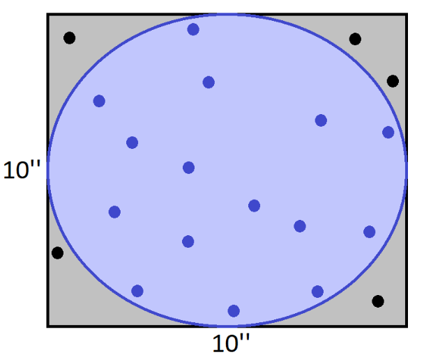 由于圓是在邊長為10英寸的正方形內(nèi),因此可以容易地計(jì)算出它的面積為78.5平方英寸。 另一種方式,我們可以在正方形內(nèi)隨機(jī)抽取20個點(diǎn)。然后,我們計(jì)算在圓內(nèi)的點(diǎn)的比例,并乘以正方形的面積。而這個數(shù)字是一個非常好的圓圈面積的近似值。