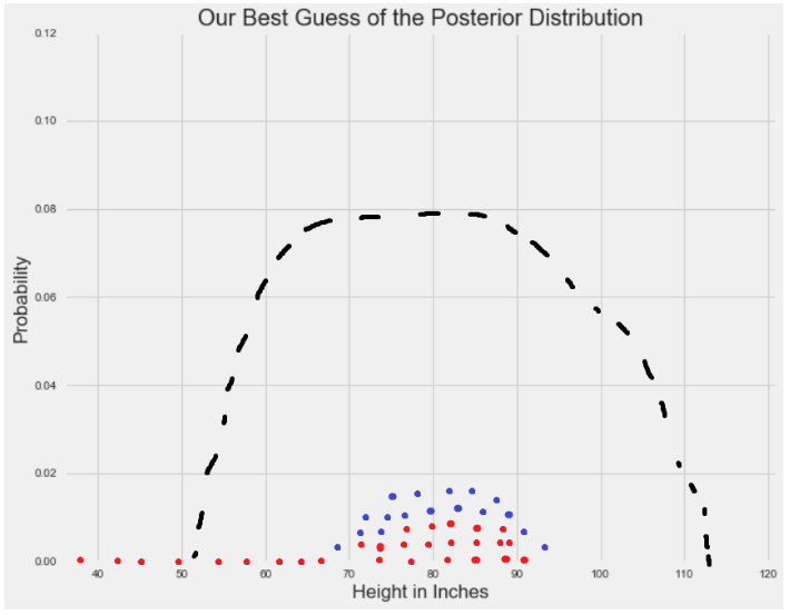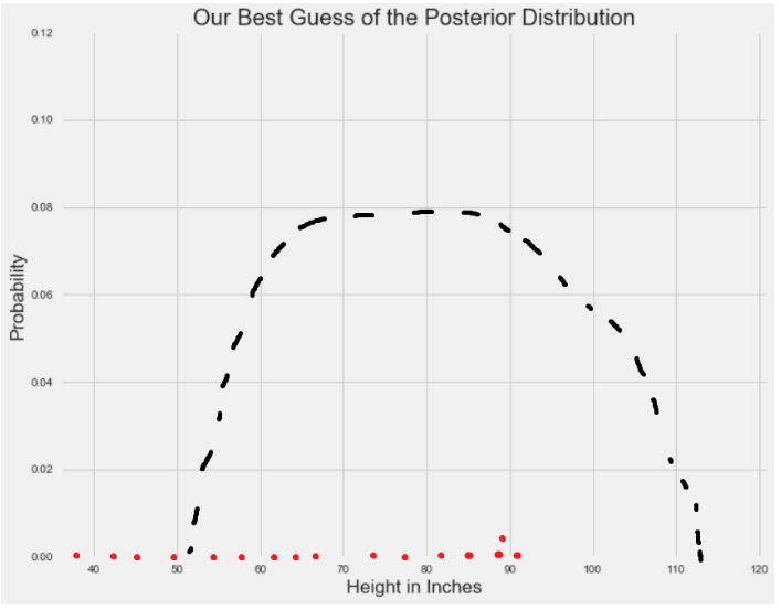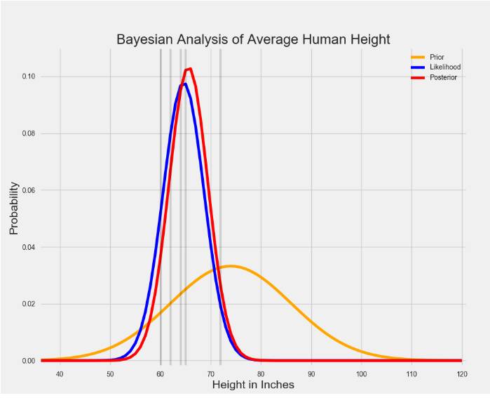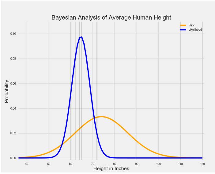 當(dāng)先驗(yàn)和可能性結(jié)合在一起時,數(shù)據(jù)(可能性分布表示)弱化了個體在巨人中長大的可能性。 盡管那個人仍然認(rèn)為人的平均身高比數(shù)據(jù)告訴他的稍高一些,但是他相信的還是數(shù)據(jù)。