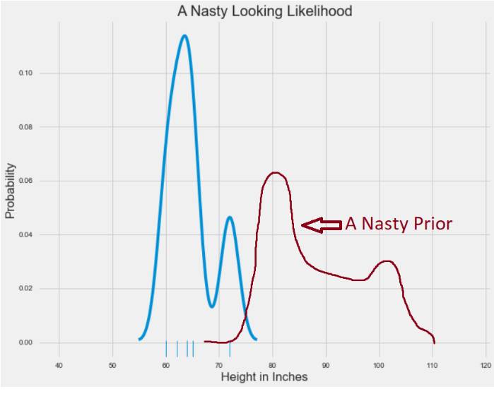 在兩條鐘形曲線的情況下,求解后驗(yàn)分布是非常容易的。 有一個簡單的方程來結(jié)合這兩者。 但是如果我們的先驗(yàn)分布和可能性分布不那么好呢?