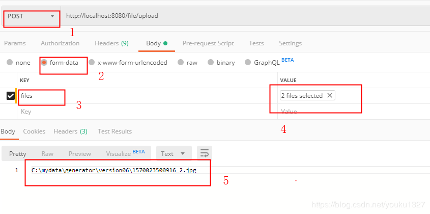 發(fā)送http的post請(qǐng)求,使用表單形式,key為files需要與MultipartFile[] 的參數(shù)名稱一致,挑選兩個(gè)文件,發(fā)送成功后,會(huì)看到最后返回的文件路徑;